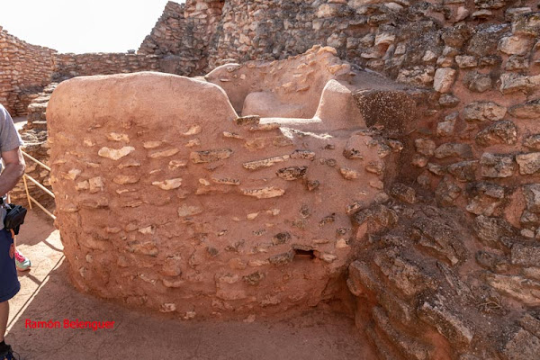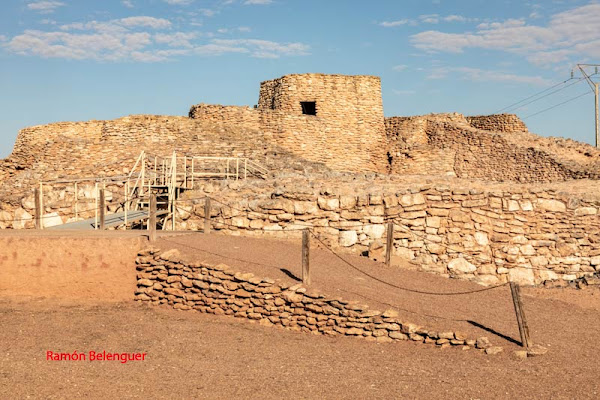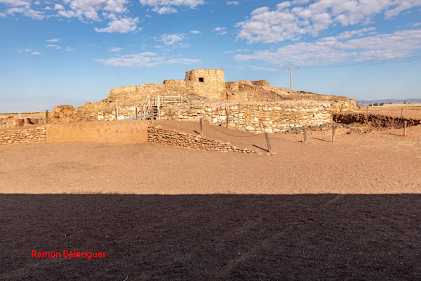 · Al exterior del núcleo fortificado se emplazaban las viviendas, en un diámetro de unos 50 metros, en el que se documentan diferentes cabañas, hogares y fosas de desperdicio. Estas casas presentan planta oval o rectangular, con zócalo de mampostería y alzado de barro, y, ocasionalmente, postes embutidos en los muros. Asociado a este espacio se localizan grandes áreas abiertas dedicadas a diferentes actividades de almacenamiento y a trabajos de producción, con presencia de fosas y restos de hogares, silos excavados en el suelo y hornos. Los análisis desarrollados en diferentes investigaciones han permitido establecer una ocupación formada por un grupo de algo más de cien individuos. Además coincide mayormente con la necrópolis, ya que se han documentado enterramientos bajo el suelo de estas casas, en torno a las mismas, o adosadas a la muralla exterior, esta distribución de los enterramientos es un ritual frecuente en la mayoría de culturas de la Edad del Bronce en la Península. Se han encontrado 61 sepulturas. El ritual funerario responde a la inhumación de un solo cadáver en posición lateral flexionada con aparente y escaso ajuar. Las fosas eran o bien revestidas por muretes de mampostería o lajas hincadas, que en ocasiones se adosaban a los muros de las viviendas o a los paramentos exteriores de la fortificación. Algunos niños se depositaron en el interior de vasijas. Los ajuares son escasos y poco representativos, constituidos por vasos de cerámica, puñales de remache y punzones de cobre arsenicado.