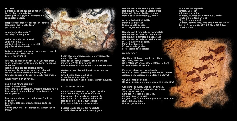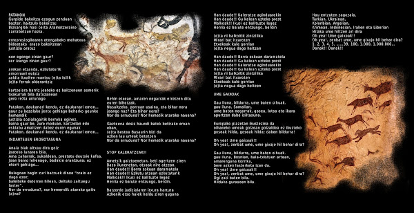 Como curiosidad, comentar que 3 de las letras se escribieron en los primeros 90: Ume Gaixoak, hablando de las víctimas inocentes, sobre todo niños, en diferentes guerras y hambrunas por todo el mundo, Indartsuen Erosotasuna, hablando del paro juvenil, y 7ak Bateginik, denunciando la atomización del nacionalismo aquí, y que desgraciadamente, 20 años después, siguen de plena actualidad.