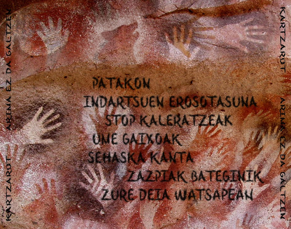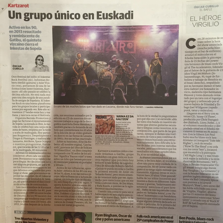En cuanto al resto de las letras, denunciamos los desahucios en Stop kaleratzeak, rendimos un homenaje al legendario bandolero vasco Patakon (personalmente tenía, como letrista, esta dedicatoria pendiente desde entonces). En Sehaska kanta, en la que, por cierto, contamos con la colaboración de Aiora Renteria (Zea Mays) y Rafa Rueda, hablamos de nuestras inquietudes como padres (a pesar de rockeros), y, por fin, en Zure Deia Watsapean nos homenajeamos a nosotros mismos; reflejando la historia del retorno de Kartzarot, y sí, nos pusimos románticos.
