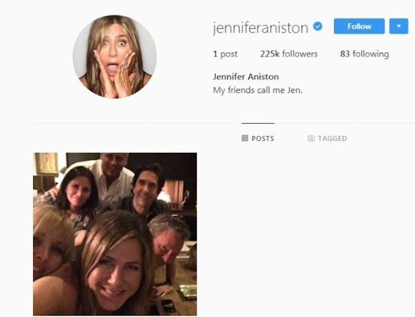 Sorprendentemente quien sí se acaba de crear un perfil en Instagram, para sorpresa de muchos, es Jennifer Aniston. La actriz ha colapsado la plataforma con su primera imagen que reúne en un selfi a sus antiguos compañeros de la serie Friends.