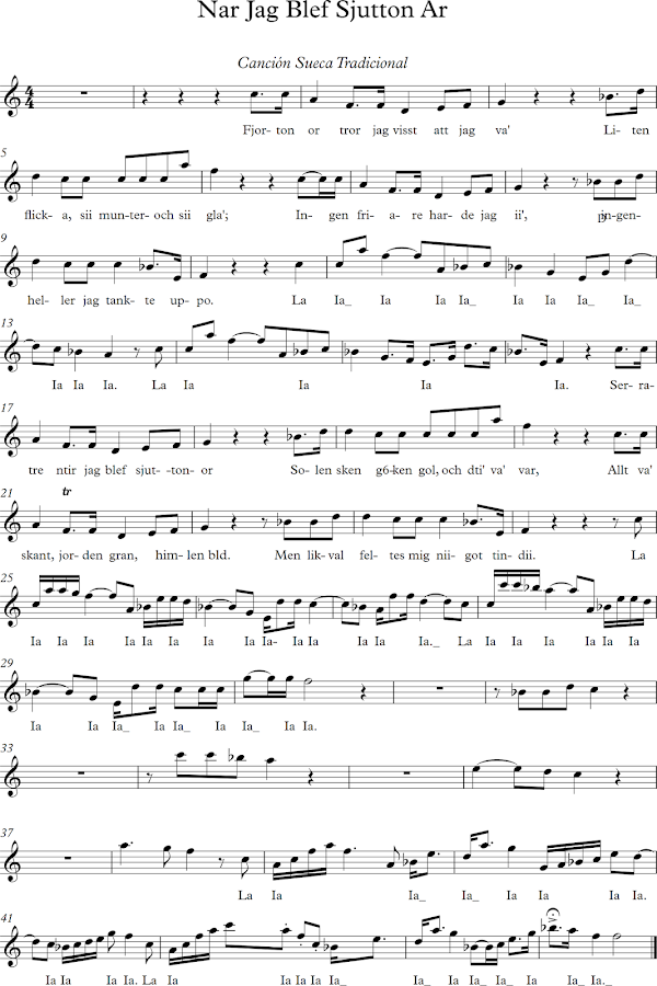 Nar Jag Blef Sjutton Ar. Partitura para flauta dulce. Canción Tradicional Sueca. La englobaremos dentro del nivel avanzado.
