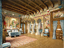 Su diseño no es funcional, sino estético. Por dentro, además de continuas referencias a leyendas y personajes medievales como Tristán e Isolda o Fernando el Católico, contiene una completa red de luz eléctrica, el primer teléfono móvil de la historia (con una cobertura de seis metros) y una cocina que aprovechaba el calor siguiendo reglas elaboradas por Leonardo da Vinci, además, una cascada que el monarca podía contemplar desde su habitación.
