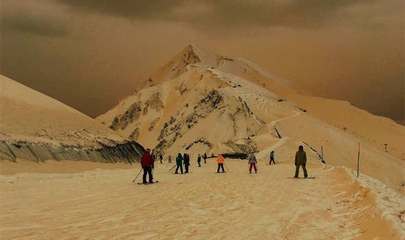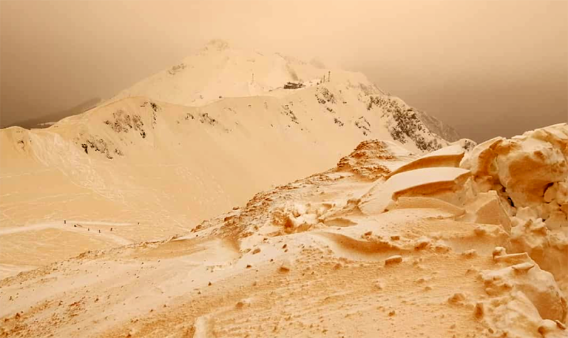 Por su parte, la llamada nieve amarilla, tiene igualmente una explicación metereológica. El caso más reciente datado se produjo el pasado viernes 23 de marzo en las montañas de Sochi (sur de Rusia). ¿Cuál fue la causa?, pues ni más ni menos que la llegada de un frente desde el Mar Mediterráneo, la isla de Creta y el norte de Africa cargado de partículas de arena del desierto del Sahara. En este caso, las partículas de polvo se condensaron en la atmósfera y cayeron precipitaciones de color amarillento. Es decir, un aspecto fundamental, aquí y a diferencia de la nieve rosa o nieve sandía sí "cayó" nieve de ese color. En un principio generó intranquilidad entre la población ante la posibilidad de que fuese consecuencia de algún agente químico, pero fue inmediatamente descartado, así el alcalde de Odessa, ciudad ucraniana donde se produjo el mismo fenómeno, informó que "las pruebas de laboratorio han revelado una mezcla arenosa en las muestras de nieve, en la que no se han encontrado agentes químicos dañinos para la salud". En zonas de menor altura, tanto en las citadas Rusia como Ucrania, incluso en Moldavia, las precipitaciones cayeron en forma de una lluvia de color rojizo.