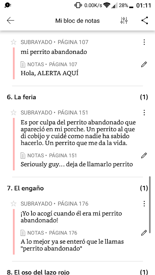 Creo que no te sorprenderá que haya encontrado muchas cosas malas así que si te gustan las historias de amor y quieres darle una oportunidad a Aquí y ahora, mejor saltate este párrafo. Okay, ¿ya? ¿sigues leyendo? que conste que te advertí. Si sigues leyendo es probable que no vayas a leer el libro o que si vayas a leerlo, pero te gusta el hate, así que comenzaré diciendo que el protagonista en ocasiones me parecía un tanto pretencioso y muy tonto. En realidad muchas situaciones del libro me parecían tontas, pretenciosas e inverosímiles, incluso el inicio del romance en la primera parte me pareció demasiado forzado y casi metido a la fuerza, ¿ya dije que el protagonista me parecía pretencioso? entonces agregale que me parecía un culero, no solo porque casi, casi le dice la palabra que comienza con Pu y acaba con ta a una empleada del súper en una escena que no tenía razón de ser sino también porque se pasa todo el tiempo diciéndole "perrito abandonado" al tipo con el que sale. Adjunto imagen de mis notas para que no crean que miento: