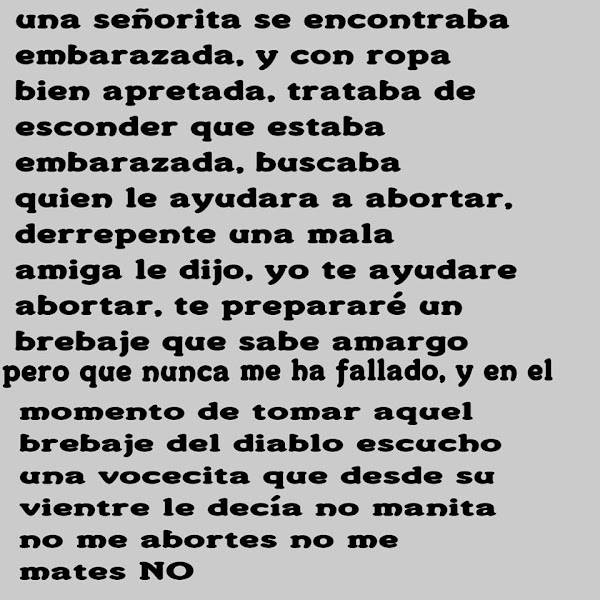 No mamita no me abortes por favor, te suplico que me tengas compasión, dame la oportunidad de nacer y decirte mamá, quiero ver la luz quiero ver el sol, de las maravillas que ha echo Dios, cuando crezca quiero ser predicador, voy a ser paciente no molestare, aunque frío sienta yo no llorare, si no hay cuna en el suelo dormiré, si no hay leche mami atol tomaré, cuando crezca yo te mantendré. En un basurero me puedes dejar tengo fe que alguien me va encontrar ,el señor jamás me va desamparar. Pero no me abortes NOFuente: En el cielo me espera mi angelito/facebook