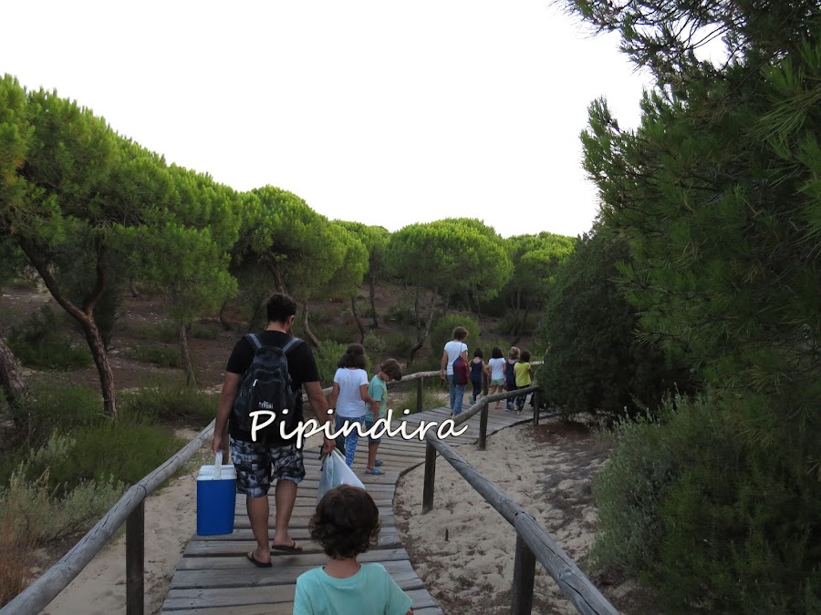 Mochila en mano, nevera y demás , como padres de una gran familia, nos dirigimos a la playa. El camino es precioso, lleno de árboles y con un delicioso aroma a fresco y a naturaleza. Como podéis ver en la foto el señor M va cargadito el pobre y parece que poco llevamos jaja. OS aconsejo que llevéis lo siguiente: