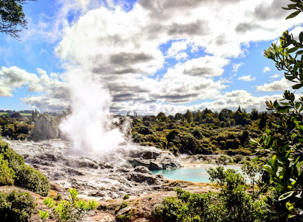 Como sólo la madre Naturaleza determina el momento en que los chorros de agua saltan a la superficie debemos esperar a que ella sea la que marque el tiempo. Pero por mucho que esperamos, a veces tarda hasta una hora, no podemos contemplar el increíble chorro de 40 metros del que tanto hablan las guías de Nueva Zelanda. Así que nos limitamos a ver las fumarolas y las modestas explosiones de vapor que continuamente salen del geiser y continuamos camino para ver otras muestras de la actividad geotérmica como las pozas donde los maories cocinan sus alimentos o la zona domesticada donde las aguas se han conducido a bañeras de cemento donde poder bañarse.