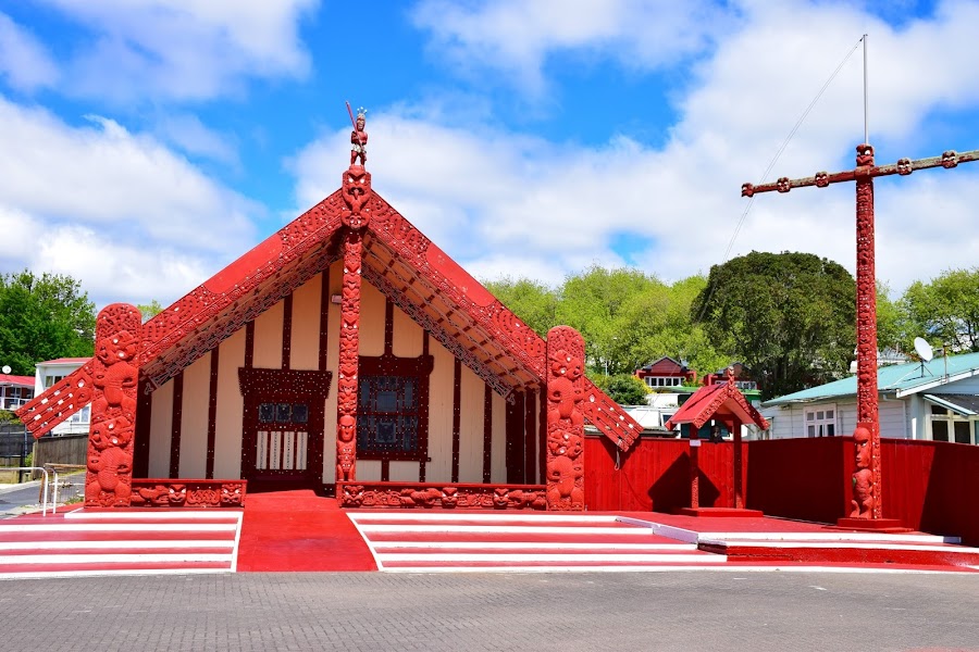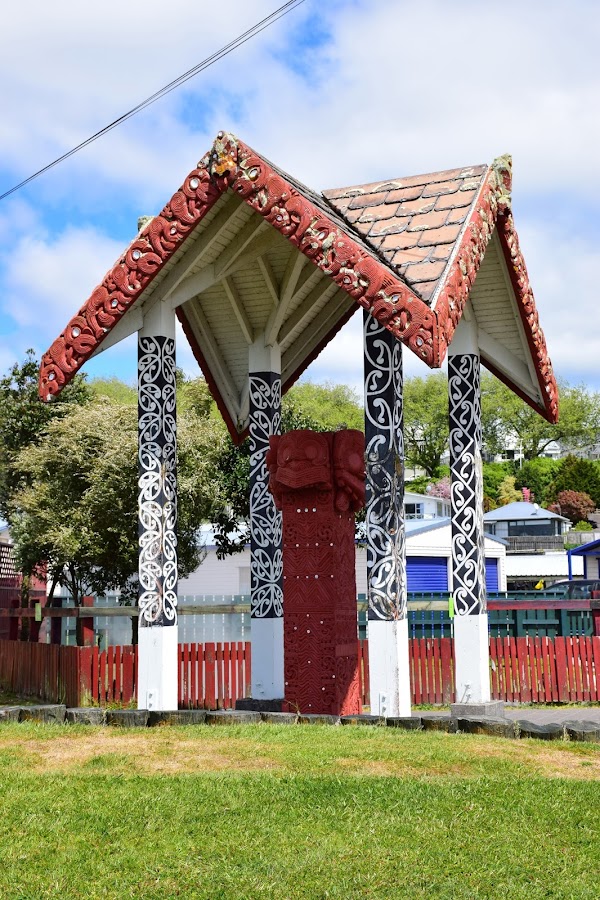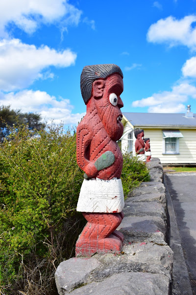 Creo que lo más acertado es aparcar nuestro vehículo en el pequeño parking a las afueras del pueblo, justo en los márgenes del lago, lleno de cisnes negros y pequeñas gaviotas y andar un poco. Lo primero que encontramos es una enorme casa de encuentros y reuniones llamada Tama-te-kapua, levantada en 1905 y que no permite la entrada a pakehas, por ser un lugar tapu (sagrado). Si que tiene una ventana por la que asomarnos y ver el interior y que comparte en una de las fotografías que podéis ver.