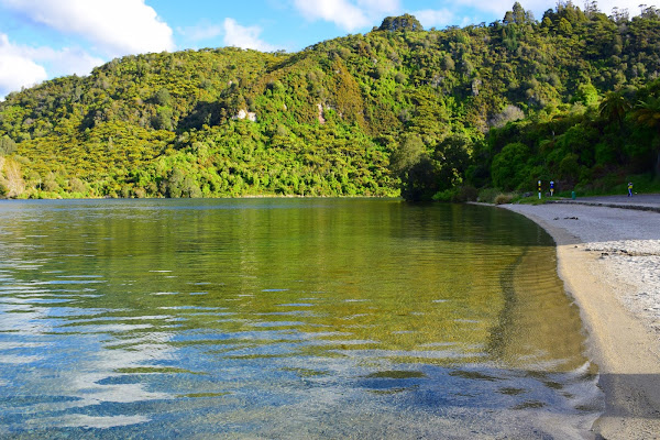La gran masa de agua es conocida entre los neozelandeses por la quietud de sus aguas, que permiten practicar todo tipo de deportes acuáticos, y bien avanzado el verano incluso bañarse, pero menos conocida es su actividad geotérmica, que calienta una playa aislada en el borde del mismo. Hasta hace poco el lugar sólo era accesible en barco, pero ahora se puede acceder por el recién inaugurado sendero de Tarawera. Aguas termales que fluyen por el lecho del lago y calientan una pequeña playa se presentaban como el lugar perfecto para terminar una jornada de exploración y relajarnos tras los centenares de kilómetros que habíamos recorrido durante el día.