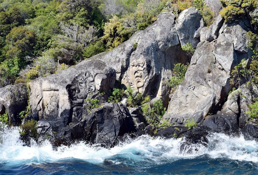Estas rocas de 10 metros de altura, fueron realizadas por el escultor Matahi Whakataka durante la década de 1970. Su localización hace que sólo sean accesibles en barca y relacionado con esto, debo decir que representan al navegante visionario Ngatoro-i-rangi, guía de las tribus que habitaron en su momento el lago Taupo, sus antepasados, descendientes y una inconmensurable pléyade de dioses, criaturas y guerreros guardianes.