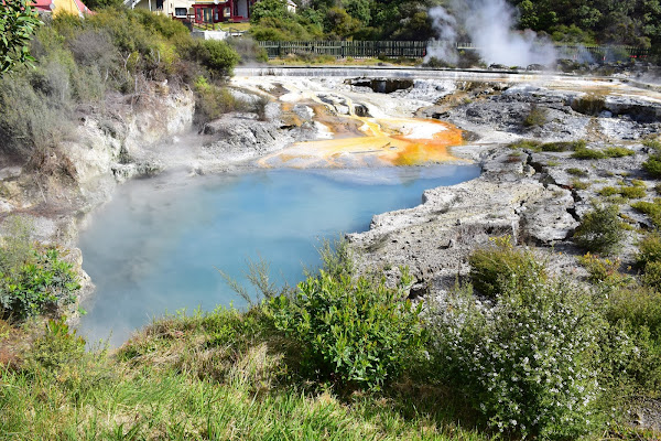 El camino parte desde una entrada adornada con un arco que recuerda a los habitantes del poblado que murieron en la primera y segunda Guerra Mundial, y tras cruzar un puente nos mete de lleno en el pueblo, en la plaza que cobija la Whare Tipuna, o Sala de Reuniones, para tomar un camino a la izquierda que discurre entre pozas de barro y varios lagos de agua hirviendo.