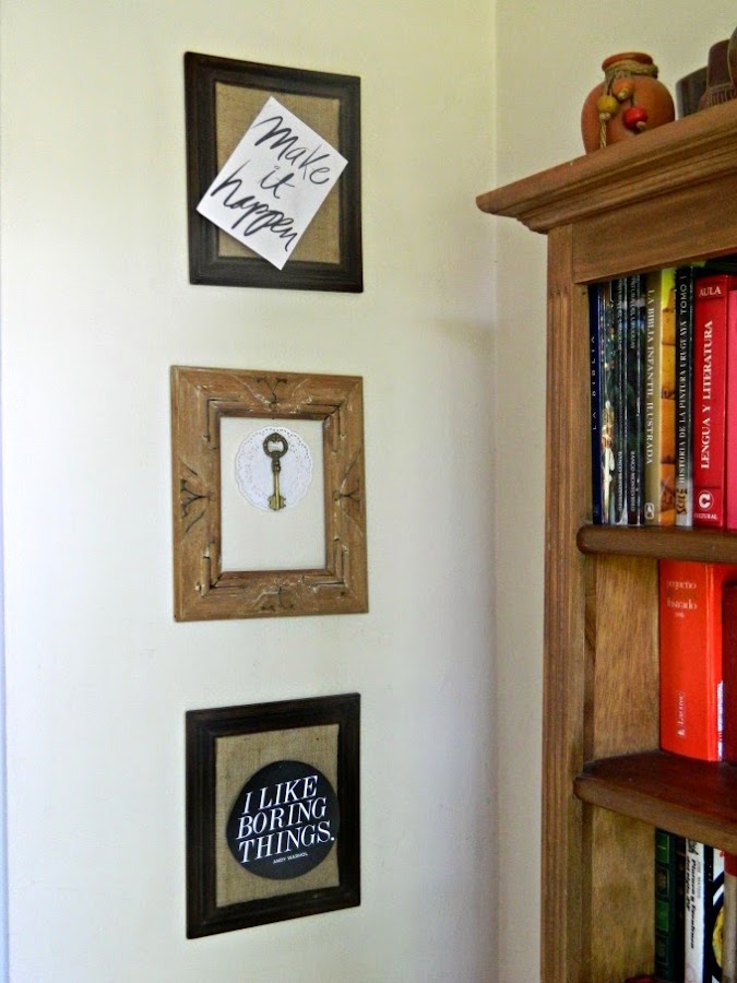 Y así, con mi característica impulsividad, hago que las cosas pasen. Que nadie se confunda, la desmesurada no desapareció, hibernaba. Es un fenómeno de adaptación ante las adversidades que supone un momento para despertar y volver al mundo. Todavía atontada por el sueño, traigo como excusa (para no llegar con las manos vacías) un pequeño cambio que realicé en la entrada de mi casa. Con dos cuadros viejitos y olvidados, algo de arpillera, una impresora temperamental -que funciona cuando quiere y como quiere- y alguna lámina simple que ya compartí en otra ocasión.
