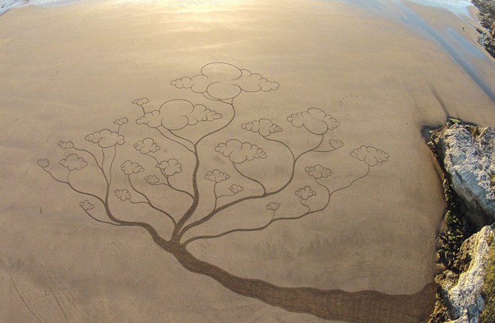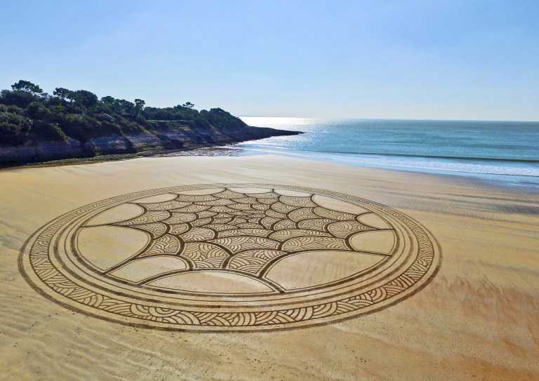Con rastrillos de diferentes tamaños ha creado más de 200 figuras en la arena de la costa de Francia y sus alrededores durante los últimos 5 años.