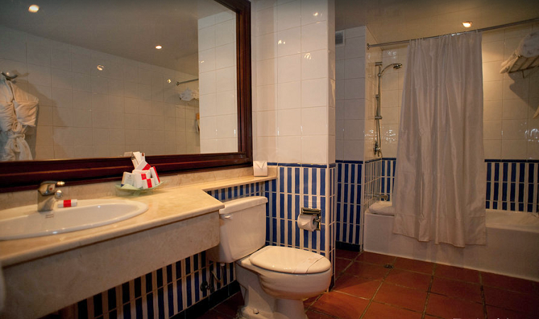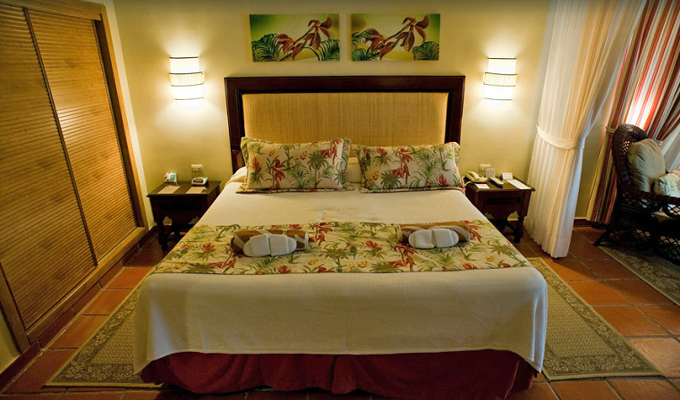 ¿Qué os parece la habitación? a mi me parece encantadora! tiene cuidados todos los detalles para que en ningún momento nos olvidemos que estamos en un lugar tan tropical como Punta Cana, pero a la vez no sobrepasa la línea de lo ridículo y además es enorme y tienen su propia terraza! Cuando vaya al Caribe quiero que mi habitación sea como esta. Y si encima mejoramos la categoría tendremos incluso vistas al mar! aunque yo me conformo con las del jardín, creo que no tendré dinero para más. El baño en cambio lo veo un poco pasado y lo de la cortina de la bañera no me gusta nada, menos para un hotel de esta categoría y un destino tan recurrido y como este, que de económico tiene poco. Son pequeños detalles pero tienen su importancia. Las habitaciones vienen equipadas con minibar, agua y refrescos (incluidos), cafetera y tetera, TV, teléfono, caja fuerte (de pago), tabla y plancha e Internet (de pago) ¿Internet de pago? muy mal.