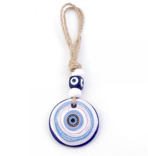 El ojo turco es un amuleto hecho a mano elaborado a partir de cristales de colores.Está formado por círculos concéntricos, que normalmente tienen los colores negro o azul oscuro, azul claro, blanco y azul oscuro.