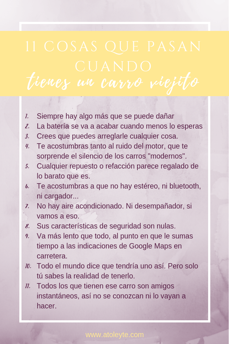 Ya que llevamos meses con él, y he sentido lo que es tener un carro bien viejito, he visto que hay cosas que pasan cuando tienes un carro así y no uno de esos nuevos, que casi ni suenan y parece que estuvieran sellados al vacío. De ahí que haya recopilado las once cosas que pasan cuando tienes un carro viejito.