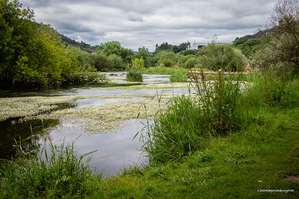 Desde esta aceña se puede divisar la frondosidad que envuelve al río, y al fondo, el puente cerca del cuál se encuentra el centro termal de Outariz.