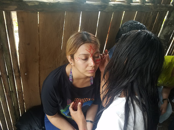 Primero pasamos por la Comunidad Shuar, quien nos dio una bienvenida, ellos hacen turismo comunitario y con lo que reciben de esta actividad pueden sustentarse. Aquí nos hicieron disparar con cerbatanas; nos pintaron las caras, a cada persona los niños le hacían un dibujo al parecer de acuerdo a tus características, el mío significaba Hija del Sol; y al final tuvimos un almuerzo típico: maito que es una forma de cocinar la tilapia, con hojas de paja toquilla y llevados a la parrilla; servido con yuca cocinada, salsa de cebolla y tomate y un vaso de guayusa.