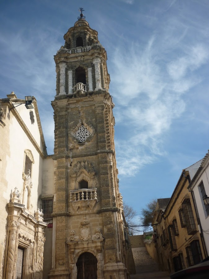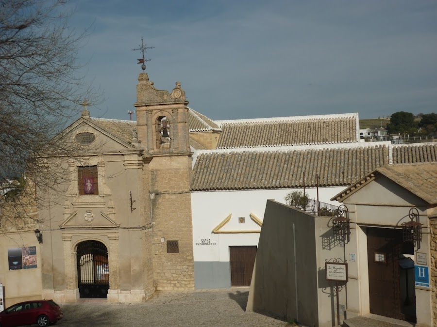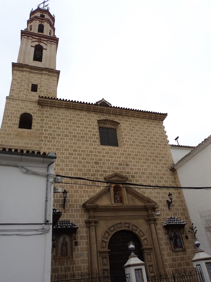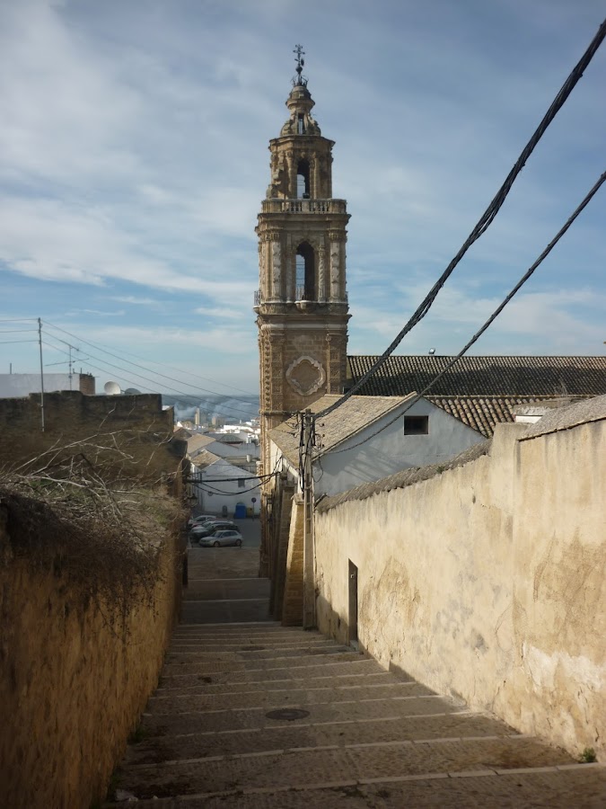 Terminada la visita por las ruinas nos dirigimos hacia el pueblo en concreto cogimos la calle cuesta de marruecos y desembocamos en la plaza de la Merced, con su iglesia y su torre. Por esta plaza hacen el recorrido varias cofradías en Semana Santa.