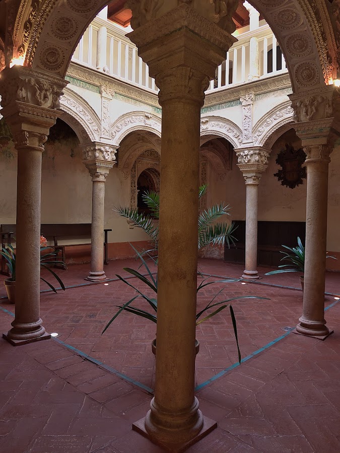 Interior casa de la cultura. antiguo convento de jesuitas. Un espacio de múltiples usos, biblioteca, conservatorio de música, salón de actos. Como la visitamos en Navidad había un portal de Belén en el centro del patio.