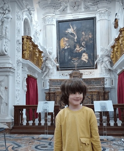 LLegamos al Oratorio de San Lorenzo, la entrada son 2€ pero con el carnet de prensa es gratis. Al entrar te sorprende el recinto, es muy pequeño pero en el frontal esta la reproducción de la Natividad con San Francisco y San Lorenzo de Caravaggio.