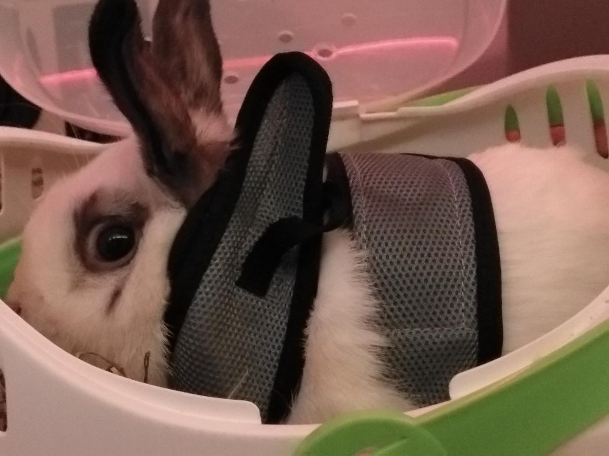 Se trata de un conejito de raza enana neozelandesa, que en su alegre caddy de plastico verde manzana y blanco perfecto, mueve nerviosamente su rosacea naricita arriba y abajo