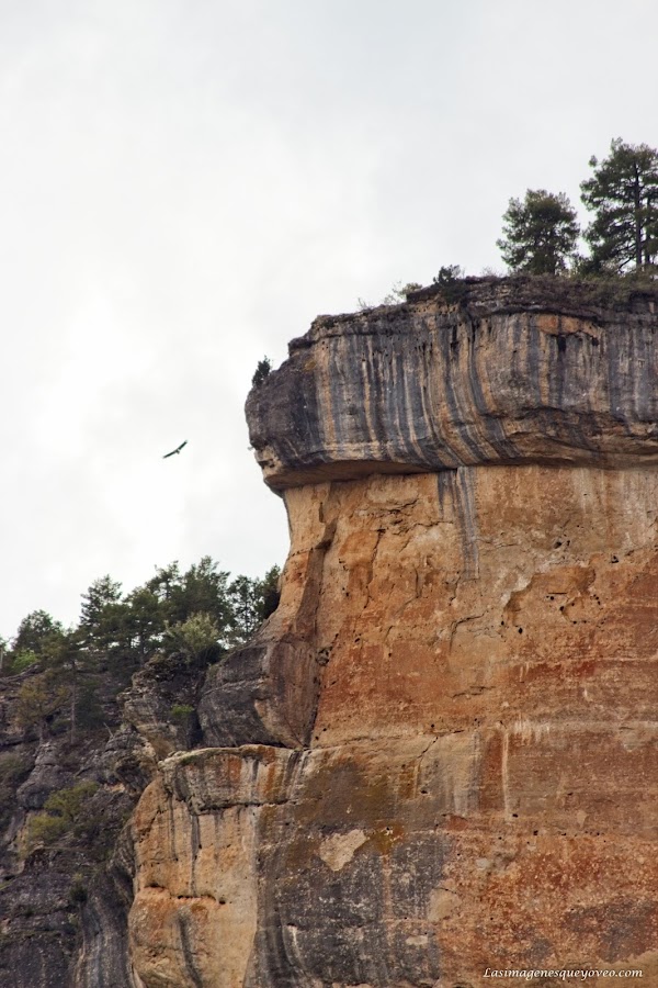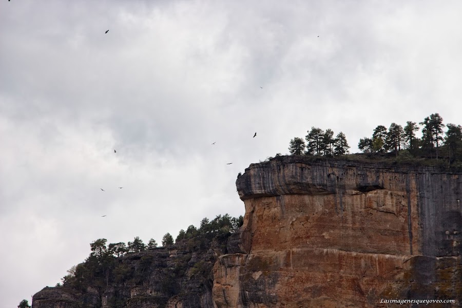 Por fin encontramos los nidos de las rapaces que se muestran a veces en gran número dependiendo de su errático vuelo. La carretera que transita en paralelo a los grandes farallones de roca no nos acerca tanto como para observar a simple vista a las aves en su propio habitat, por lo que tenemos que usar toda la potencia óptica de nuestro objetivo para poder observar a las aves rapaces dibujando continuos círculos mientras sobrevuelan sus buitreras.