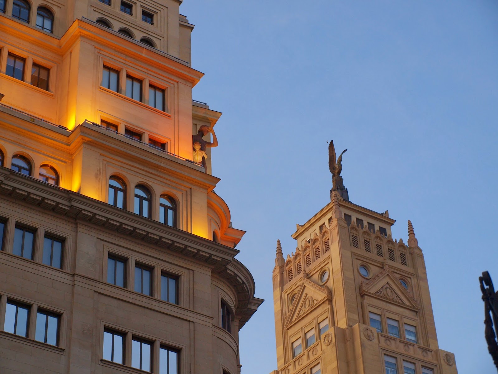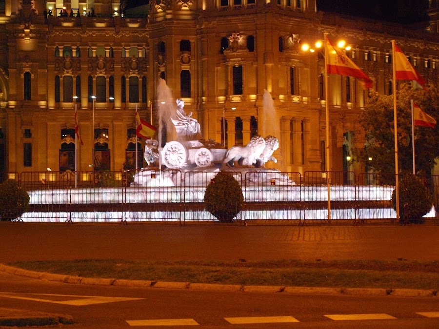 Colores fríos nacidos de la fuente de la Diosa, y de fondo, tonos cálidos de la fachada del Palacio de Comunicaciones.