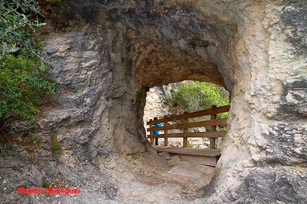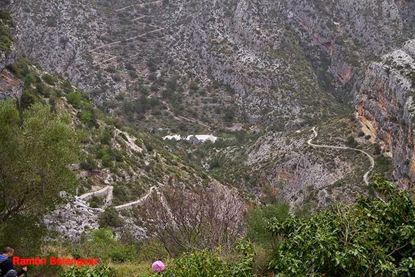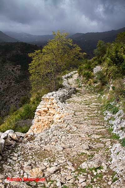 En él recorreremos la catedral del senderismoson 14 kilómetros y un desnivel acumulado de 815 metros, lo más llamativo del recorrido son los aproximadamente 6.873 escalones excavados en la roca de origen morisco.Estos escalones servían de acceso a las zonas de labor agrícola, zonas de bancales donde nos encontramos antiguos cultivos, como higueras, olivos, vid, almendros y algarrobos. Se trata de un recorrido de los llamados rompepiernas, son cuatro bajadas y tres de subidas enlazadas sin zonas llanas donde recuperar, que unen les Juveesd´alt y d´Enmig con Fleix y Benimaurell atravesando el rio Girona y los barrancos del Infierno y de Racons. ?Les juvees? son las casas que los lugareños usan en verano para trabajar las tierras, y ?Les Jovades? era una medida utilizada para la repartición de la tierra durante la repoblación posterior a la reconquista y a la expulsión de los moriscos, siendo la cantidad de terreno que podía arar un mulo durante un día