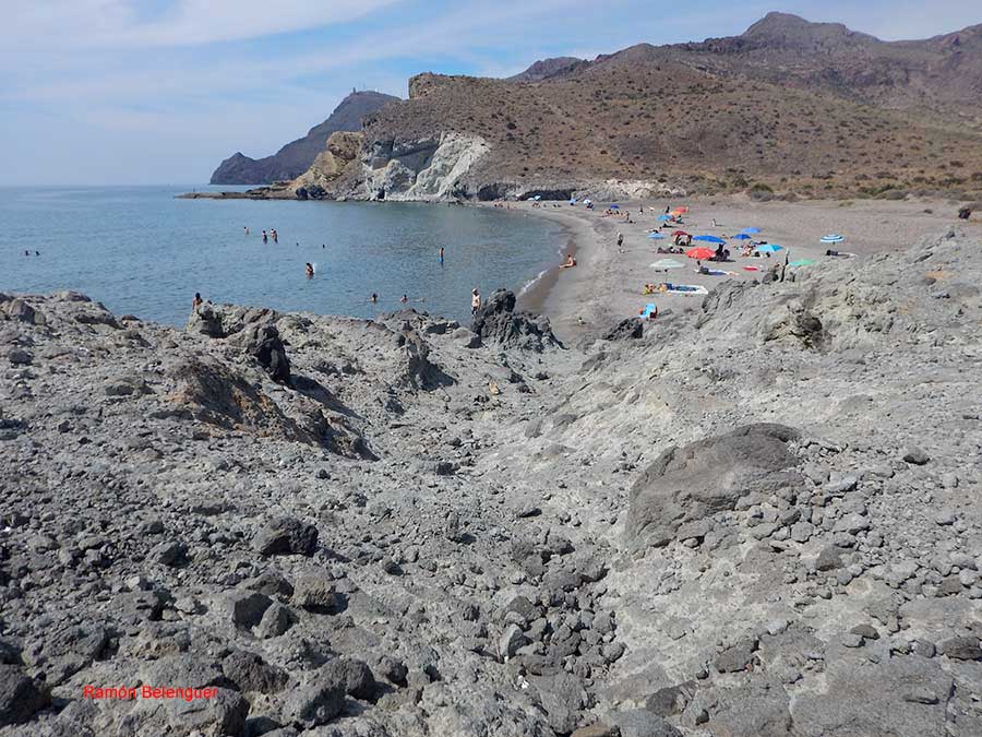 Sus acantilados están formados por piedras volcánicas. Es una playa de arena fina y de unos 300 metros de longitud. En su parte oriental se halla la Duna de Mónsul, una duna rampante donde la arena, con la ayuda del viento, asciende sobre un montículo volcánico. No se debe dejar de contemplar la famosa “Ola petrificada”, situada en el centro de la playa. Esta playa ha sido escenario de numerosos rodajes cinematográficos como El Viento y el León (1975), Las Aventuras del Barón Munchausen (1988), Indiana Jones y la última cruzada (1989), Las cosas del querer (1989) o El hombre que perdió su sombra (1989).