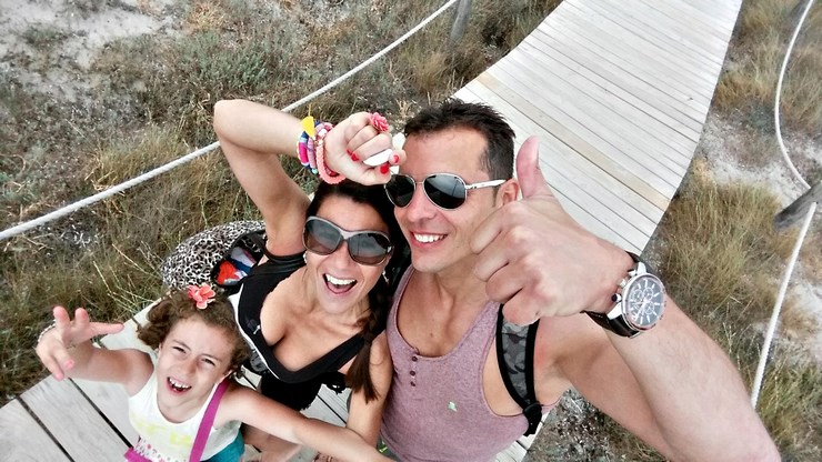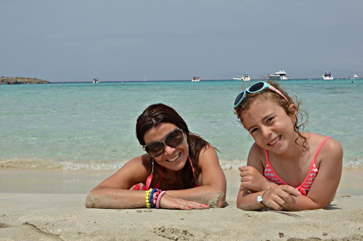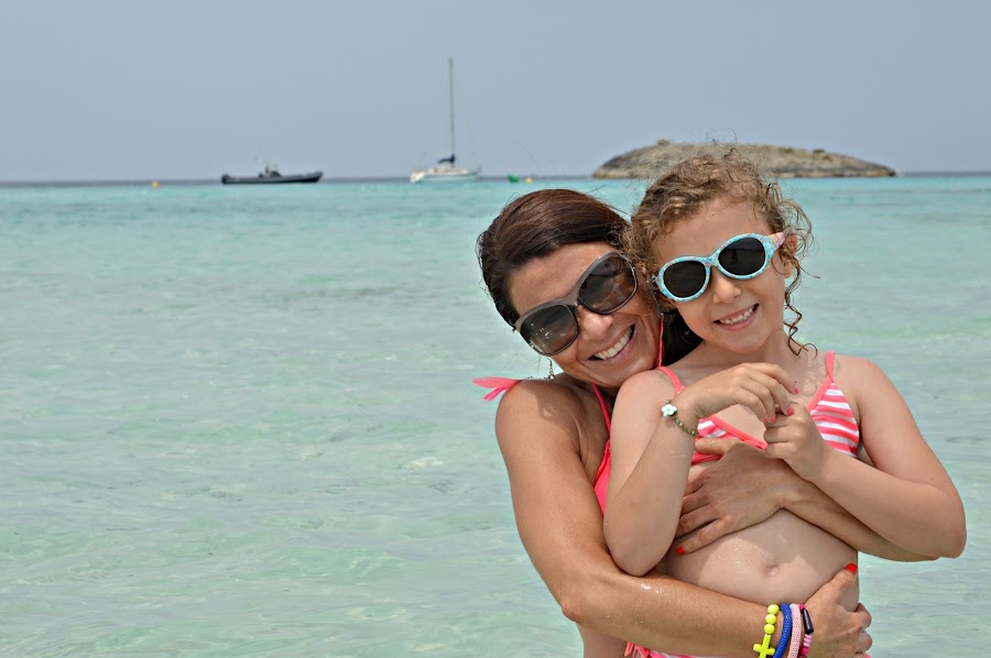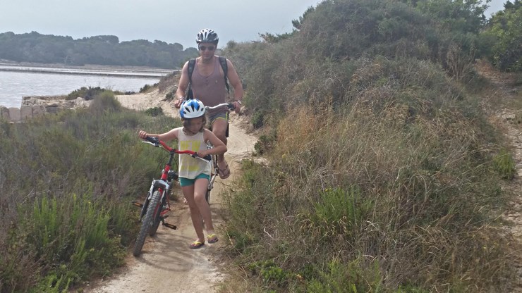 ¡Qué os voy a contar! ya se que las chancletas no son lo mas apropiado para un paseo en bici , pero chic@s, estamos en Formentera, el paraíso del buen tiempo, y de las playas, así que está permitido!, lo mas importante es que llevamos los cascos y sobre todo que el paseo hasta llegar a la playa está preparado en un bonito sendero, al lado de las salinas, donde hago una pequeña parada para explicarle a mi hija de donde viene la sal que echamos en las comidas. ¡Se queda con la boca abierta!.