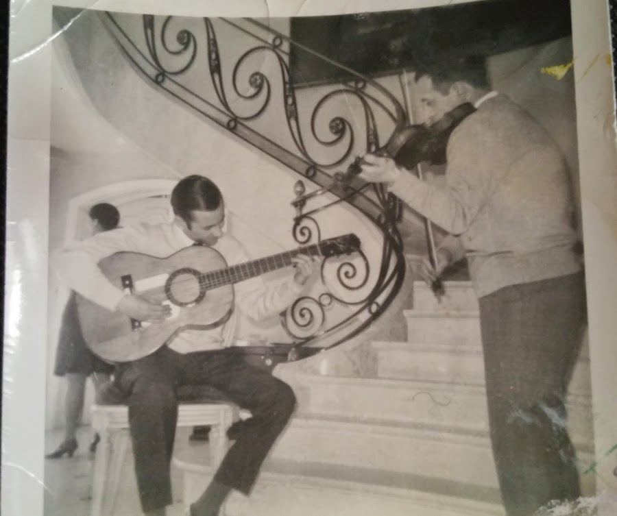 El autor en sus fiestas en Bruselas, tocando la guitarra.