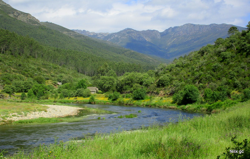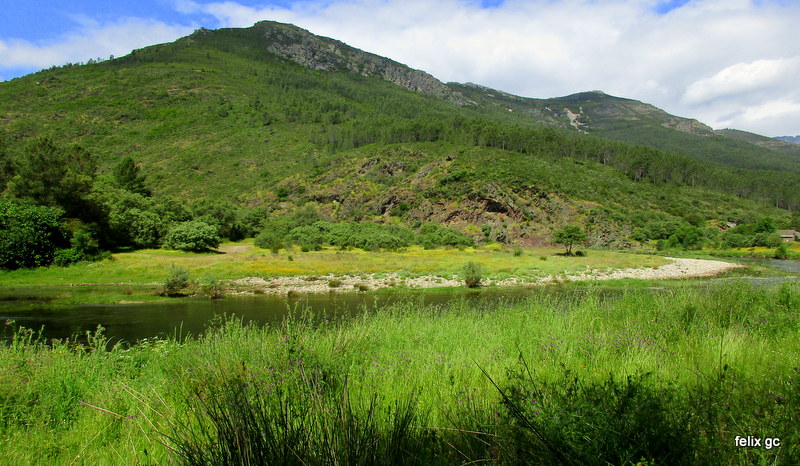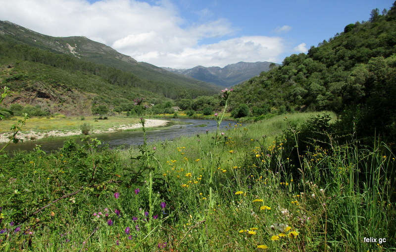 El rio Alagon ,surcando sus valles,y con un muy buen caudal,consecuencia de las abundantes lluvias de esta primavera,asi mismo de todo el verdor que cubre todo este extenso paraje,salpicado por el colorido de las flores que permanecen impasibles,esperando su normal fin ,su declive ,al menos por estos lares,como cada final de primavera,principios de verano.