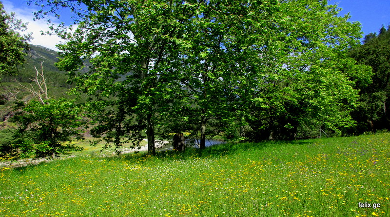 Verdes praderas ,a orillas del rio,que te invitan descansar en ellas,o simplemente a sentarte sobre su manto verde,fresco mullido,por la cantidad de hierba que posee y deleitar las pupilas con el colorido de las flores que forman este tapiz primaveral,no se si es privilegio ,o no,pero asi me siento yo ,en esos magicos momentos.