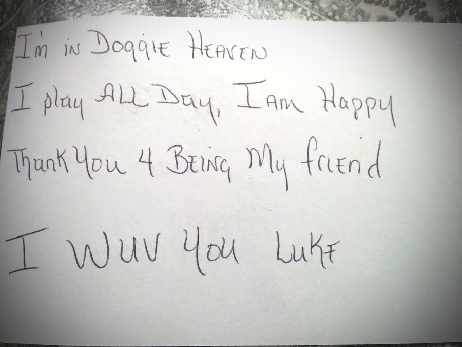 Su madre Mary había planeado buscar más tarde la carta para que el cartero no llegase a recogerla, pero se le olvidó. Y... ¡Sopresa! El pequeño Luke recibió una carta escrita por Zina Owens, una trabajadora de correos. "Estoy en el cielo de los perros. Juego todo el día. Estoy feliz. Gracias por ser mi amigo. Te quiero Luke", decía la misiva.