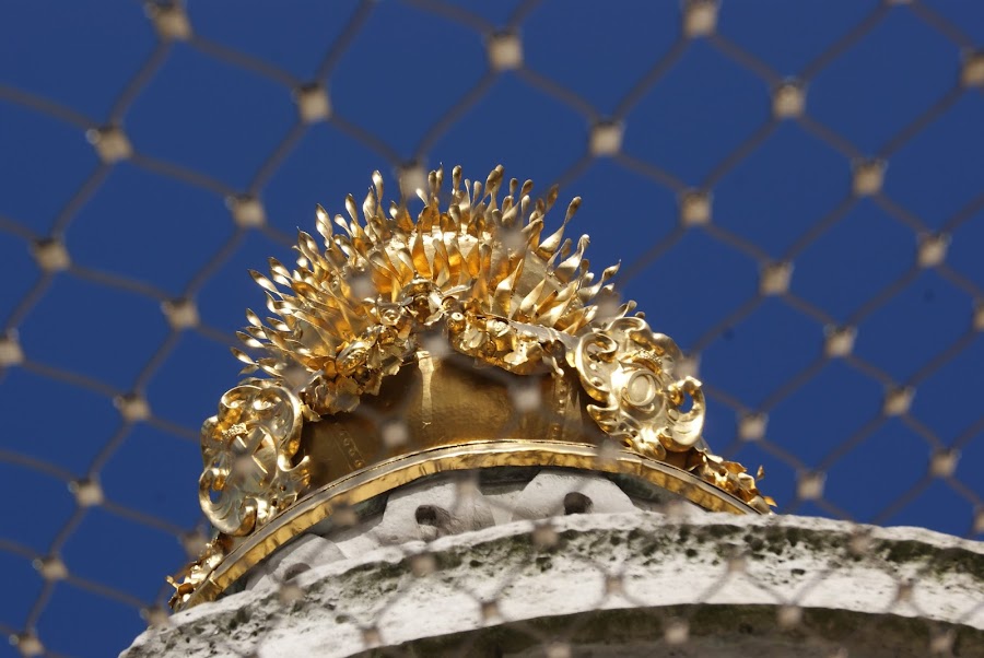 Si miramos arriba, vemos que sobre el tambor de granito hay una bola o una urna, depende de cómo la miremos desde la que brotan unas llamas, todo en dorado, simbolizando el Gran Fuego. Las llamas no se cobraron muchas vidas, pero si que destruyeron miles de viviendas, iglesias e incluso las puertas de la ciudad.