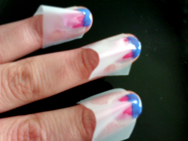 1. Pinta tus uñas de un color como de costumbre. Recorta trocitos de celo con formas (triángulos, cuadraditos, rombos...) y colócalos en la uña, sobre el esmalte bien seco, en la zona que prefieras. Pinta por encima de otro color diferente y cuando esté seco, quita el celo con cuidado.