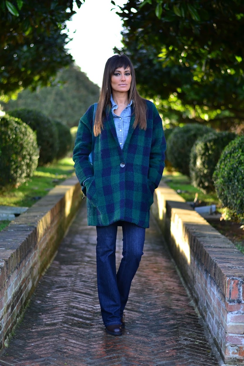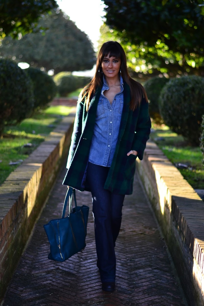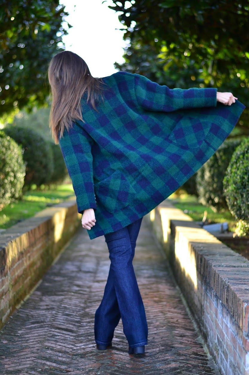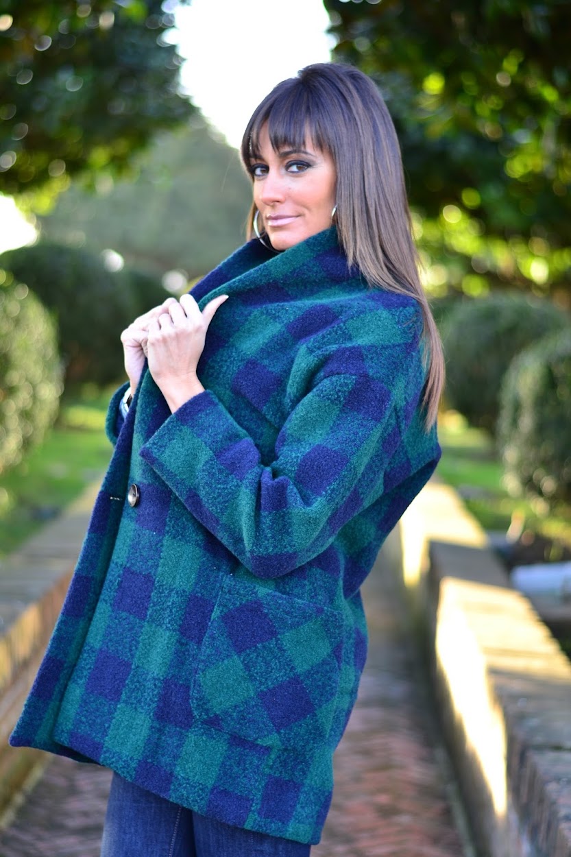 Para hoy concretamente, he elegido este modelo a cuadros (un estampado clásico y a la vez muy actual) en dos colores tan discretos como son el verde oscuro y el azul marino, con solapa larga, que además estiliza, precisamente de esta tienda de ropa, que ya se ha convertido en una de mis favoritas.