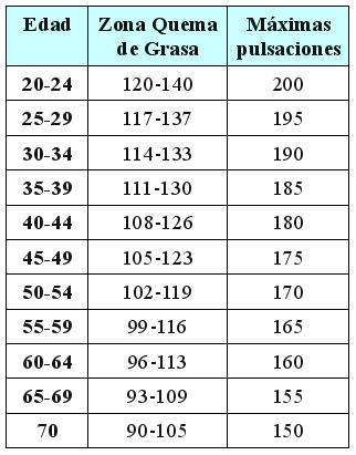 Sobre los ejercicios aeróbicos ( tipo correr, andar, escaleras...) donde nuestro trabajo se basa en pulsaciones y quema de grasas (aunque también se tonifica porque el músculo trabaja pero en menor medida) explicaré como funcionan posteriormente. Tendremos que trabajar a un ritmo de un 60-70% de nuestra capacidad para estar en una zona de quema de grasas. Es un ritmo un poco superior al normal, la prueba es que aún podremos hablar . No es como una carrera.Dejo una tabla a la izquierda para conocer cual es vuestra zona de quema de grasas por si queréis hacerlo tomándoos las pulsaciones.