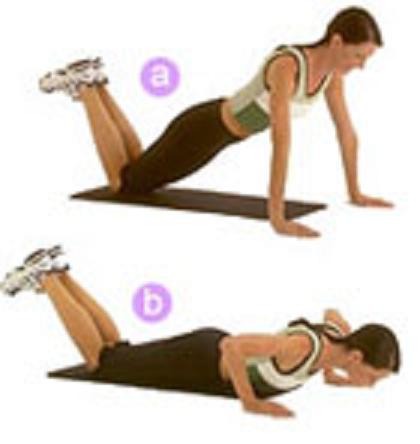 4.Pectoral El pectoral lo trabajaremos con las conocidas flexiones, hay ejercicios más concretos pero las flexiones trabajan también nuestros brazos y espalda. Nos tumbaremos en el suelo boca abajo y apoyaremos las rodillas. Abriremos los brazos con la misma anchura de los hombros y realizaremos el ejercicio. Haremos 3 series de 12 a 15 repeticiones. Ver vídeo: