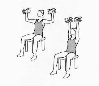 2.Tríceps Adoptaremos la postura de la imagen. De pie con una mancuerna en una mano la estiramos por encima de nuestra cabeza, sujetándonos el codo con la otra. Para hacer una repetición llevaremos la mano con la mancuerna por detrás de la cabeza. Haremos 3 series de 12 a 15 repeticiones. Video: