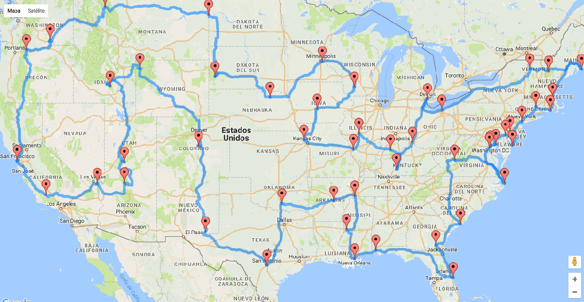 Si el tiempo del que dispones para realizar este viaje no es un problema, no te pierdas a continuación la ruta óptima para visitar el mayor número de lugares icónicos en Estados Unidos (aunque necesitarías al menos dos meses para completarla de manera más o menos relajada) creada por Randy Olson.