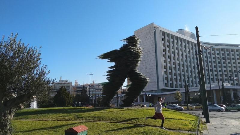 El miércoles lo dedicamos a Oli y un poquito a mí, ejejejejej, nos levantamos, recogimos y con la mochilas nos fuimos a ver la estatua del corredor The runner que se encuentra en la Plaza Omonia y me hacía mucha ilusión la foto.
