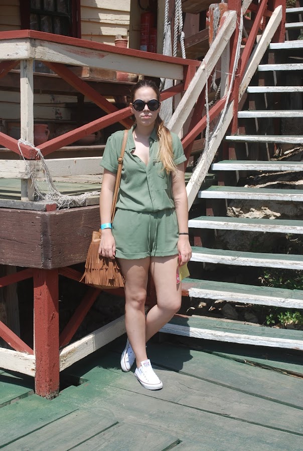 Para pasar el día en el parque quería ir cómoda, así que nada mejor que mi jumpsuit verde militar y converses, ya que nos tocó ir caminando al parque porque no sabían decirnos donde se cogía el autobús que nos llevaba.