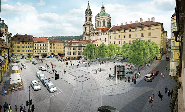 Al salir de la iglesia siguiendo la calle Karmelitská llegamos a la Plaza Malostranské námesti. Antiguamente habitaban el barrio muchos artesanos alemanes, el barrió creció tras el incendio de 1541, muchos nobles se instalaron allí, alrededor del castillo. El estilo mayoritario del barrio es el barroco, de ahí que se le conozca como "la perla del barroco".
