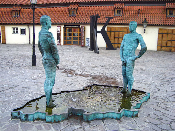 A la derecha del puente está el Museo de Franz Kafka. Es interactivo. Justo en la entrada está la fuente de David Černý. Dos hombres orinando sobre la silueta de la República Checa.