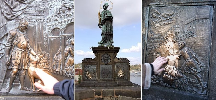 Puente Carlos IV, de las 30 estatuas que tiene destaca la de San Juan Nepomuceno. Representado con aura de estrellas porque al ser arrojado y su cuerpo entró en el agua surgieron 5 estrellas. Los relieves de los laterales están brillantes porque según la tradición hay que tocarlos para que nos concedan deseos.