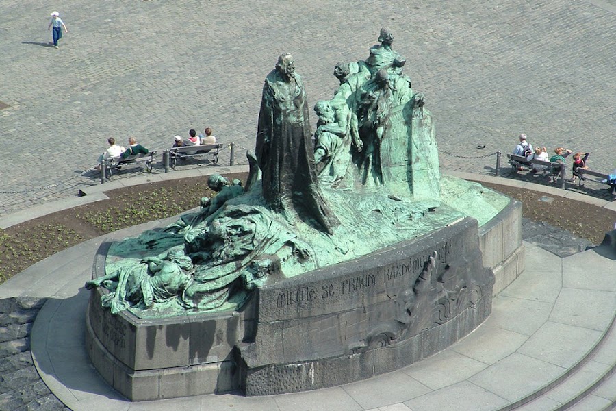 Delante de la Iglesia y en el centro está la estatua del reformista checo Jan Hus, quemado en la hoguera condenado por herejía.
