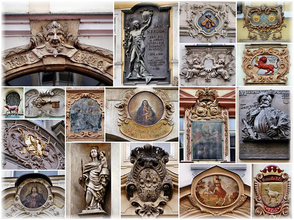 Y ya nos dirigimos hacia el castillo de Praga subiendo por la calle Nerudova, se la conoce como camino real. Los portales históricos de las casas cuentan con adornos con signos históricos de las casas como relieves, estatuas, cuadros puestos en la entrada que en la Edad Media cumplieron la función de lo que sería la actual numeración de la calle. Según su signo las casas recibían también sus nombres. La casa de los dos Soles, la de la Llave de Oro, la del León rojo.