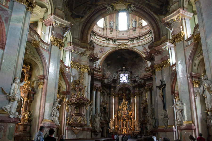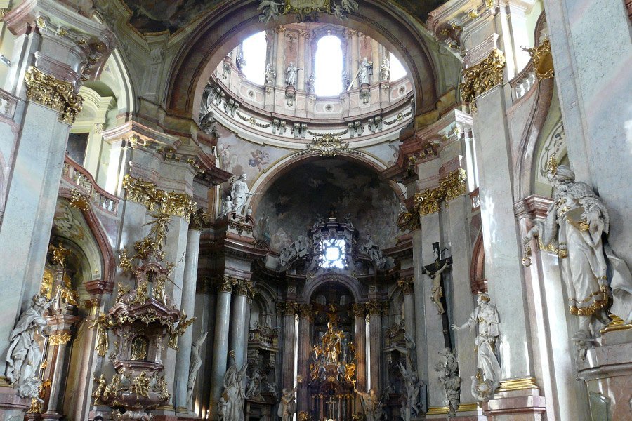 Iglesia de San Nicolás, es considerada la iglesia barroca más bonita de Praga y es una de las tres iglesias dedicadas a este santo en Praga. Dos torres flanqueando un gran domo central que se eleva 46 metros.